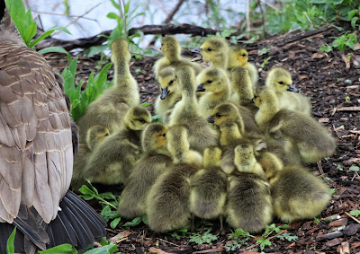 I can't seem to help myself; the Goslings are just too cute! It won't be long before they have grown past this phase. Recent cool mornings have kept the young geese tucked under Mom's warm feathers.