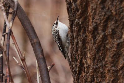 Brown Creepers can be found spiraling up trunks and main branches as they look for food by probing into crevices and picking at loose bark with their slender, downcurved bills. They burn an estimated 4-10 calories per day. By eating a single spider, a Creeper gains enough energy to climb nearly 200 feet vertically!