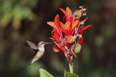 On the first day of October, a female Ruby-throated Hummingbird visited our backyard. They prefer to feed on red or orange flowers. Cana Lilies are one of the very few non native flowers in our garden.... and the only red flowers blooming this late in the year. Ruby-throated Hummingbirds are eastern North America's only breeding hummingbird, breeding east of the Rockies. In terms of area, this species occupies the largest breeding range of any North American Hummingbird.