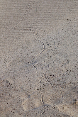 Mysterious Tracks on the beach: These tracks caught my attention as being out of the ordinary. It looked like a stick had been dragged through the sand, but there were no footprints. We concluded it was made by plant material blowing down the beach and even had it confirmed by a tracking expert! Some of the lines were intermittent which would be caused by changing wind strength and wind direction.